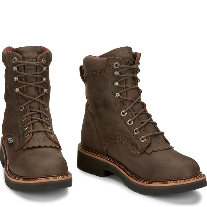 Our 8" tall lace-up work boot Rivot has a mild distressed hickory brown color. This boot is not only stylish but also built to endure the toughest work conditions. The oil and slip resistant durable polyurethane outsole provides excellent traction, ensuring your safety on any surface. You can take on any challenge with confidence. This boot is designed to keep you steady on your feet and meets all ASTM 2892 safety footwear standards.